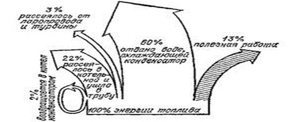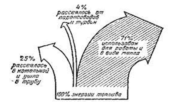 Большой научный и технический опыт по устройству тепловых двигателей и глубокие теоретические исследования, касающиеся условий работы тепловых двигателей, установили, что к. п. д. теплового двигателя зависит от разности температур нагревателя и холодильника. Чем больше эта разность, тем больший к.п.д. может иметь паросиловая установка (конечно, при условии устранения всех технических несовершенств конструкции, о которых упоминалось выше). Но если разность эта невелика, то даже самая совершенная в техническом смысле машина не может дать значительного к.п.д. Вместо увеличения температуры в котле можно было бы понижать температуру в конденсаторе. Однако это оказалось практически неосуществимым. При очень низких давлениях плотность пара очень мала и при большом количестве пара, пропускаемого за одну секунду мощной турбиной, объем турбины и конденсатора при ней должен был бы быть непомерно велик. Кроме увеличения к.п.д. теплового двигателя, можно пойти по пути использования «тепловых отбросов», т. е. теплоты, отводимой водой, охлаждающей конденсатор. Вместо того чтобы спускать нагретую конденсатором воду в реку или озеро, можно направить ее по трубам водяного отопления или использовать ее для промышленных целей. Можно также производить расширение пара в турбинах только до давления 5-6 атм. Из турбины при этом выходит еще очень горячий пар, могущий служить для ряда промышленных целей. Станция, использующая отбросы теплоты, снабжает потребителей не только электрической энергией, полученной за счет механической работы, но и теплотой. Она называется теплоэлектроцентралью (ТЭЦ).