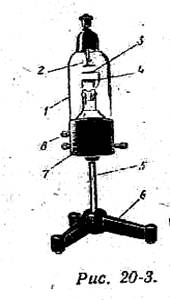 Демонстрационный диод (рис.1) представляет собой стеклянный баллон 1 цилиндрической формы диаметром 45 мм и высотой 90 мм, в котором находятся два электрода - катод 3 и анод 2. В баллоне создан высокий вакуум порядка 10-6 мм рт. ст.