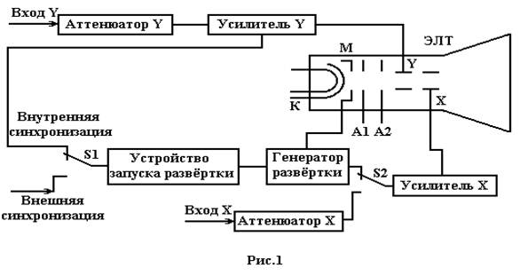 Упрощённая структурная схема универсального осциллографа представлена на рис.1. Он состоит из электронно-лучевой трубки (ЭЛТ) и двух каналов управления лучом: канала Y и канала X. В канал Y входят аттенюатор Y и усилитель Y. В канал X входят: устройство запуска развёртки, генератор развёртки, аттенюатор X и усилитель X. Основным узлом осциллографа является электронно-лучевая трубка, представляющая собой стеклянную колбу с высоким вакуумом, внутри которой жёстко закреплены электронная пушка и две пары взаимно перпендикулярных отклоняющих пластин: пластины Y и X. Электронная пушка служит для создания узкого пучка электронов – электронного луча. В её состав входят: подогреваемый катод К, управляющий электрод (модулятор) М и два анода А1 и А2. Первый анод служит для фокусировки луча, второй – для ускорения электронов луча. Электронный луч образует на экране ЭЛТ светящуюся точку. Пластины Y служат для отклонения луча по вертикали, на них подаётся исследуемое напряжение U(t) по каналу Y. Пластины X служат для отклонения луча по горизонтали, на них подаётся напряжение развёртки UX(t). При работе осциллографа с внутренней развёрткой на пластины X от генератора развёртки подаётся пилообразное напряжение, возрастающее по линейному закону. Под воздействием его электронный луч отклоняется и светящаяся точка перемещается по экрану в горизонтальном направлении с постоянной скоростью. При работе осциллографа с внешней развёрткой напряжение развёртки подаётся через вход X от внешнего источника. Аттенюаторы служат для ослабления больших сигналов, а усилители для усиления малых сигналов.