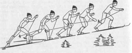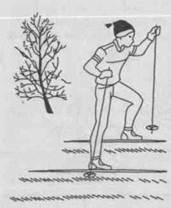 Рис. 20. Подъем скользящим шагом гом фазы скольжения и стояния лыжи по времени примерно равны. При преодолении подъемов любым способом большое значение имеет активная работа рук, что уменьшает возможность проскальзывания лыж при увеличении крутизны подъемов. По сравнению с попеременным двухшажным ходом при подъеме скольжением (рис. 20) увеличивается наклон туловища, уменьшается длина шага, толчок рукой заканчивается одновременно "с отталкиванием ногой. Уменьшается амплитуда в работе рук и ног -они выносятся вперед энергичным маховым движением сразу после окончания толчков, «замах» почти отсутствует. Период работы (отталкивание) одной рукой наслаивается на толчок другой рукой, поэтому с увеличением крутизны подъема опора палками становится непрерывной. С дальнейшим увеличением крутизны подъема все эти изменения в технике по сравнению с попеременным двухшажным ходом еще более заметны. Все это диктуется необходимостью увеличить сцепление лыж со снегом и избежать их проскальзывания. Увеличивается и угол отталкивания ногой, что требует более активной работы рук. Палка ставится на снег под углом около 65 - 75°. Отталкивание ногой становится более продолжительным. Свободная нога выполняет маховое движение в период толчка другой ногой. При выносе ноги вперед недопустимо «выскальзывание» стопы, так как это вызывает стопорящее положение и затрудняет выполнение переката, что, в свою очередь, вызывает другие нарушения техники. Подъем скользящим шагом изучается со школьниками вначале на пологих подъемах (до 3°) на хорошо подготовленной лыжне. Предварительно набрав скорость на ровном участке, школьники преодолевают отрезок подъема длиной 25-30 м. Постепенно с освоением техники преодоления подъема скользящим шагом крутизна склона увеличивается до 5-6°. Но спешить с дальнейшим увеличением крутизны подъемов не следует до тех пор, пока школьники прочно не освоят технику скользящего шага. Преждевременный переход на более крутые склоны затрудняет у школьников освоение техники их преодоления. Большую роль при этом играет физическая подготовка, особенно уровень развития силы мышц плечевого пояса. Подъем беговым шагом применяется на склонах средней крутизны, а при плохом скольжении - и на более пологих подъемах. Переход на этот способ преодоления подъема зависит и от других факторов. При этом наблюдается значительное сокращение времени скольжения, что может привести к временному переходу на бег с фазой полета. В этом способе длина выпада в 3-4 раза больше длины скольжения. Маховые движения и подседания выполняются быстро, что позволяет поддерживать достаточно высокий темп движения. В целом способ похож на бег на полусогнутых ногах при сохранении многих деталей подъема скользящим шагом. Подъем ступающим шагом применяется в условиях, когда скольжение невозможно или нецелесообразно (из-за большой затраты сил). Это связано прежде всего с увеличением крутизны подъемов, но и условия сцепления лыж со снегом играют важную роль. Исключительно большое значение здесь имеют скорость выпада, энергичное отталкивание стопой и палкой. Обучение школьников этому способу подъема по координации особых затруднений не вызывает, но преодоление самых крутых подъемов требует хорошей физической подготовки. Подъем «полуелочкой» (рис. 21) применяется при