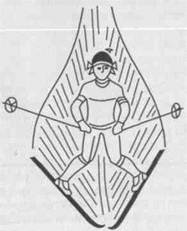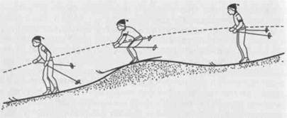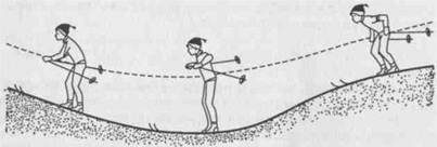 Рис. 28. Преодоление неровностей на склоне При спаде сила трения уменьшается, лыжник как бы выскальзывает вперед и возможно падение назад. Здесь необходимо при подходе к спаду подняться в более высокую стойку, а при переходе через край спада опуститься в более низкую стойку и увеличить наклон тела вперед. И в том и в другом случае после прохождения крутизны склона необходимо принять обычную стойку спуска. Устойчивость лыжника при преодолении мелких неровностей -бугров, впадин - во многом зависит от надежного контакта лыж со снегом. Любой отрыв приводит к тому, что лыжи могут стать неуправляемыми. Это часто способствует падению. Кроме того, важно достичь относительной прямолинейности траектории общего центра тяжести - лыжник добивается этого снижением на буграх и повышением на впадинах. Все это добивается пружинистым сгибанием и разгибанием ног, а также компенсаторными движениями туловища и рук. При первоначальном обучении следует разъяснить школьникам причины падений при преодолении неровностей, затем показать приемы их преодоления и научить быстрому изменению глубины стойки при прохождении бугров и впадин. С этой целью необходимо выполнить несколько подготовительных упражнений на ровном склоне: 1. Многократные пружинистые приседания при спуске в основной стойке. 2. Подобрать на склоне 2-3 предмета (варежки, флажки), после каждого наклона и приседания возвращаться в основную стойку. 3. Преодоление при спуске нескольких ворот с приседаниями под ними и выпрямлениями между ними. После выполнения указанных упражнений можно приступить к преодолению неровностей сначала на небольшой скорости, а затем на склонах. Подъезжая к бугру, лыжник выпрямляется, принимая более высокую стойку. При наезде на бугор лыжник приседает, проходя его вершину в глубокой группировке. При скатывании с бугра, чтобы избежать фазы полета, необходимо быстро выпрямиться. Глубина приседания и быстрота движений зависят от скорости и величины бугра. При преодолении впадины или ямы необходимо выполнить все движения в обратной последовательности. Подъезжая к впадине, следует снизить высоту ОЦМ (принять более низкую стойку), проезжая впадину - выпрямить ноги, выезжая из нее -вновь присесть. С увеличением скорости спуска все движения выполняются быстрее. Сгибание ног, наклон туловища при наезде на бугор и выпрямление при преодолении впадины позволяют «сгладить» неровности склона - общий центр тяжести