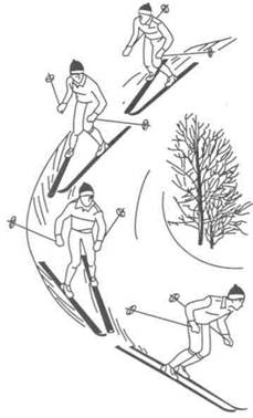 Поворот «плугом» (рис. 33) применяется на склонах средней крутизны с мягким неглубоким снежным покровом на небольшой скорости, и, если есть необходимость, в процессе поворота можно погасить лишнюю скорость. Для начала поворота лыжник принимает положение «плуга»; затем, поставив внешнюю лыжу на внутреннее ребро и немного выводя ее вперед, переносит на нее массу тела (для поворота влево загружается правая лыжа и наоборот). Лыжник движется по дуге поворота, пока сохраняется принятое положение. В зависимости от скорости спуска и величины препятствий изменяется и скорость движения лыжника при изменении глубины стойки. Загружать лыжу необходимо медленным и