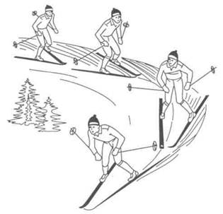 стке после спуска или даже при движении по совсем ровному месту. В этом случае он обычно выполняется с одновременным отталкиванием палками, что еще больше увеличивает скорость движения лыжника. Другая разновидность - поворот переступанием с наружной лыжи применяется значительно реже и чаще всего при спуске с невысокой скоростью. При этом повороте тяжесть тела переносится на внутреннюю лыжу, а наружная отставляется пяткой в сторону и, перенося на нее вес тела, лыжник приставляет внутреннюю палку к наружной. Затем все движения повторяются. Оба поворота обязательно следует изучать в обе стороны, постепенно крутизна склона и скорость спуска увеличиваются, а радиус поворота уменьшается. Затем необходимо добиваться уверенного овладения поворотом из прямого спуска в спуск наискось и наоборот, а также из спуска наискось в одну сторону в спуск наискось в другую. Поворот упором (рис. 32) выполняется на склонах средней крутизны при неглубоком снежном покрове и достаточно высокой скорости, когда поворот переступанием уже неприменим. Для выполнения поворота необходимо предварительно перенести массу тела на одну из лыж (внутреннюю по отношению к повороту); другую, свободную от массы тела, ставят в положение упора: пятка лыжи отведена в сторону, носок выводится чуть вперед и лыжа кантуется на внутреннее ребро. Для выполнения поворота массу тела необходимо перенести на лыжу, находящуюся в упоре. Крутизна поворота зависит от угла отведения пятки лыжи, угла кантования лыжи, состояния снежного покрова и величины переноса массы тела. Школьники обычно легко осваивают этот способ поворота. Вначале положение упора имитируется на ровном месте, учащиеся выполняют и перенос массы тела. Упражнение повторяется несколько раз. Затем они пробуют выполнить поворот на хорошо подготовленном склоне. Поворот необходимо обязательно изучать и в ту и в другую сторону. У школьников при выполнении этого поворота встречаются следующие ошибки: малы углы отведения пятки лыжи и кантования, мало переносится масса тела на наружную лыжу, недостаточно выдвигается вперед носок лыжи. Школьники, освоившие торможение упором, обычно легко овладевают данным поворотом.