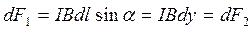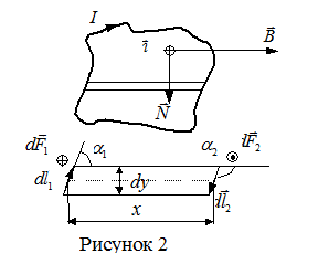 Ограничимся рассмотрением плоских контуров.Пусть плоский контур – рисунок 2 – ориентирован так, что положительная нормаль к контуру перпендикулярна к вектору индукции однородного магнитного поля. (Положительной называется нормаль, направление которойсвязано с направлением тока в контуре правилом правого винта.) Вычислиммомент сил действующих на контур. Разобьем контур на полоски шириной , параллельные вектору . На ограничивающие подоску элементы контура и действуют силы и - направленные перпендикулярно плоскости чертежа в противоположные стороны. Модули этих сил равны по закону Ампера