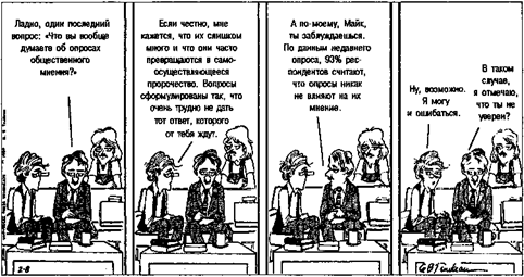 (— Ладно, один последний вопрос: «Что вы вообще думаете об опросах общественного мнения?» — Если честно, мне кажется, что их слишком много и что они часто превращаются в самоосуществляющееся пророчество. Вопросы сформулированы так, что очень трудно не дать тот ответ, которого от тебя ждут. — А по-моему, Майк, ты заблуждаешься. По данным недавнего опроса, 93% респондентов считают, что опросы никак не влияют на их мнение. — Ну, возможно. Я могу и ошибаться. — В таком случае, я отмечаю, что ты не уверен?) Исследователи, которые проводят опросы общественного мнения, должны чутко реагировать на едва различимые и вполне различимые источники ошибок