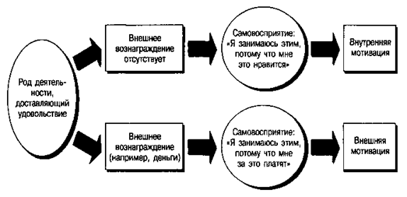 Рис. 4.3. Когда люди без всякого вознаграждения или принуждения занимаются тем, что им нравится, они объясняют свои действия склонностью к данной деятельности. Вознаграждение, «поступающее извне», потому подрывает внутреннюю мотивацию, что заставляет людей именно ему приписывать свое поведение