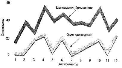 <Сила и успех моего мнения, моего убеждения крепнут бесконечно в то мгновение, когда их признает другой разум. Новалис. Фрагмент> Трудно быть «белой вороной». Наверное, именно поэтому случаи, когда жюри присяжных не может вынести вердикт, потому что кто-то один имеет «особое мнение», крайне редки. Практический урок, который мы можем извлечь из этих экспериментов, заключается в том, что значительно легче отстаивать свою точку зрения, если можно найти себе союзника. Это известно многим религиозным группам. Следуя примеру Христа, апостолы которого парами проповедали его учение, мормоны всегда посылают к своим соседям одновременно двух миссионеров. Поддержка даже одного единомышленника значительно увеличивает социальную храбрость человека. Наблюдая за тем, как кто-то выражает отличное от других мнение, мы сами можем стать более независимыми, даже если этот человек и заблуждается. Шантан Немет и Синтия Чайлз пришли к такому выводу после того, как испытуемые наблюдали за человеком, единственным из группы, в которой было 4 человека, назвавшим голубые стимулы зелеными (Nemeth & Chiles, 1988). Хотя этот человек, выразивший не совпадающее с другими мнение, и был не прав, наблюдавшие за ним испытуемые продемонстрировали независимость по-своему: в 76 случаях из 100 они правильно называли красные стимулы «красными», хотя остальные называли их «оранжевыми». Другие же испытуемые, у которых не было такого примера храбрости, проявили конформизм в 70% случаев.