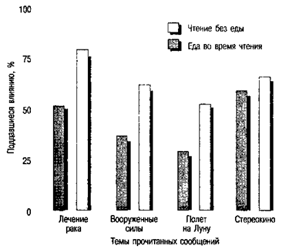 Рис. 7.3. Для испытуемых, которым можно было есть во время чтения, сообщения оказались более убедительными, чем для тех, которые не ели. (Источник: Janis, Kaye & Kirschner, 1965)