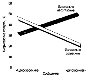 Рис. 7.5. Зависимость влияния информации, учитывающей мнение оппонентов и не учитывающей его, от изначального мнения слушателя. После победы над Германией во Второй мировой войне на американских солдат, сомневавшихся в мощи Японии, наибольшее воздействие оказало «двустороннее» сообщение, в котором излагались аргументы в поддержку этой позиции и против нее. Те же солдаты, которые считали войну с Японией серьезным испытанием, под влиянием «одностороннего» сообщения укрепились в своем мнении. (Источник: Hovland, Lumsdaine & Sheffield, 1949)