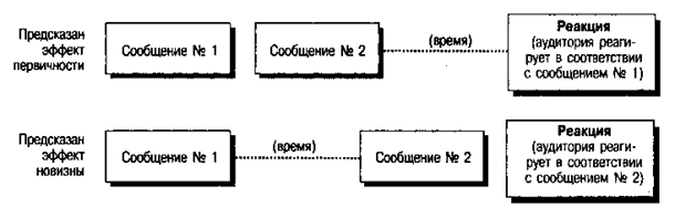 Рис. 7.6. Эффект первичности или эффект новизны? Если два убеждающих сообщения следуют непосредственно одно за другим, а аудитория должна отреагировать на них спустя некоторое время, преимущество на стороне первого сообщения (эффект первичности). Если между двумя сообщениями проходит какое-то время, а аудитория должна отреагировать на них вскоре после второго сообщения, преимущество на стороне второго сообщения (эффект новизны)