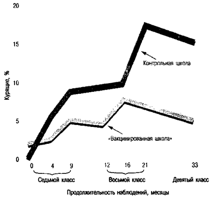 Чтобы продемонстрировать практическую ценность результатов лабораторных исследований, группа ученых во главе с Альфредом Мак-Алистером сделала «прививки» семиклассникам против втягивания в курение сверстниками (McAlister et al., 1980). Подростков научили следующим образом реагировать на рекламный слоган «Курящая женщина — свободная женщина»: «Какая же она свободная, если “подсела” на табак?!» Они также участвовали в ролевых играх, в ходе которых — после того, как их называли «несмышленышами» за отказ от сигареты, — они отвечали примерно следующее: «Если бы я согласился закурить ради того, чтобы произвести на тебя впечатление, вот тогда я точно был бы несмышленышем!» После нескольких подобных занятий во время обучения в седьмом и в восьмом классах среди «привитых» учеников было в два раза меньше склонных к тому, чтобы начать курить, чем среди их ровесников в другой школе, среди родителей которых было примерно столько же курильщиков (рис. 7.11).
