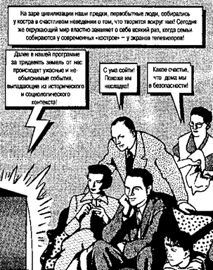 (На заре цивилизации наши предки, первобытные люди, собирались у костра в счастливом неведении о том, что творится вокруг них! Сегодня же окружающий мир властно заявляет о себе всякий раз, когда семьи собираются у современных «костров» — у экранов телевизоров! — Далее в нашей программе за тридевять земель от нас происходят ужасные и необъяснимые события, выпадающие из исторического и социологического контекста! — С ума сойти! Похоже им несладко! — Какое счастье, что дома мы в безопасности!) Счастливый мир (Tom Tomorrow)