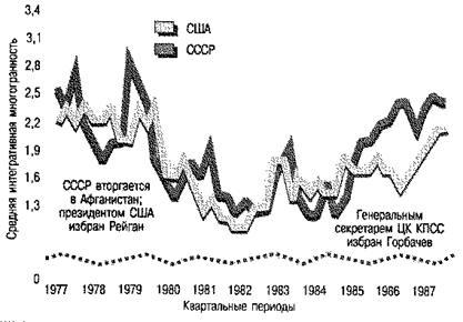Рис. 13.4. Многогранность официальных советских и американских политических заявлений (1977-1986).(Источник: Tetlock, 1988)