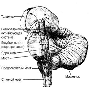 Очень часто.ретикулярную формацию называют источником активности организма, поскольку формируемые данной структурой нервные импульсы определяют работоспособность организма, состояние сна или бодрствования. Необходимо также отметить регулирующую функцию данного образования, поскольку формируемые ретикулярной формацией нервные импульсы отличаются по своей амплитуде и частоте, что приводит к периодической смене функционального состояния коры головного мозга, которая, в свою очередь, определяет доминирующее функциональное состояние всего организма. Поэтому состояние бодрствования сменяется состоянием сна и наоборот (рис. 4.10).