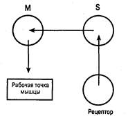 В упрощенном виде эта схема выглядит так: из моторного центра (М) в мышцу (рабочую точку мышцы) поступают эффекторные команды. От рабочей точки мышцы идут афферентные сигналы обратной связи в сенсорный центр (3). В ЦНС происходит переработка поступившей информации, т. е. перешифровка ее в моторные сигналы коррекции, после чего сигналы вновь поступают в мышцу. Получается кольцевой процесс управления (рис. 5.3).