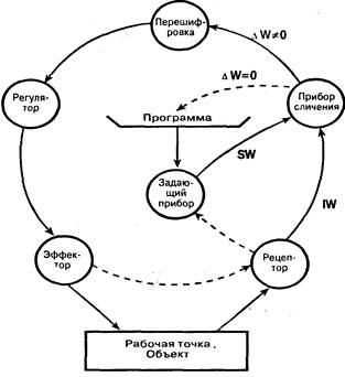 Рис. 5.3. Принципиальное различие концепций построения движений на основе рефлекторной дуги и рефлекторного кольца. Объяснения в тексте В этой схеме рефлекторная дуга выглядит как один из ее частных случаев, когда совершаются движения, не нуждающиеся в коррекции, т. е. движения рефлекторной природы. Позднее Бернштейн детализировал схему рефлекторного кольца. В схеме присутствуют следующие элементы: моторные «выходы» (эффектор), сенсорные «входы» (рецептор), рабочая точка или объект (если речь идет о предметной деятельности), блок перешифровки, программа, регулятор, задающий прибор, прибор сличения. С наличием большего количества элементов рефлекторное кольцо функционирует следующим образом, В программе записаны последовательные этапы сложного движения. В каждый конкретный момент отрабатывается какой-то частный этап или элемент, соответствующая частная программа запускается в задающий прибор. Из задающего прибора сигналы (SW — «то, что должно быть») поступают на прибор сличения. На тот же блок от рецептора приходят сигналы обратной связи (IW — «то, что есть»), сообщающие о состоянии рабочей точки. В приборе сличения эти сигналы сравниваются, и на выходе из него получаются сигналы рассогласования (В\У) между требуемым и фактическим положением вещей. Далее они попадают на блок перешифровки, откуда выходят сигналы коррекции, которые через промежуточные инстанции (регулятор) попадают на эффектор (рис. 5.4). Рассматривая данную схему, необходимо обратить внимание на одну интересную деталь. Рецептор не всегда посылает сигналы на прибор сличения. Бывают случаи, когда сигнал поступает сразу на задающий прибор. Это бывает в тех случаях, когда экономичнее перестроить движение, чем его корректировать. Это особенно важно в экстренных ситуациях. Помимо рефлекторного кольца Бернштейн выдвинул идею об уровневом построении движений. В ходе своих исследований он обнаружил, что в зависимости от Глава 5. Психологическая теория деятельности •141