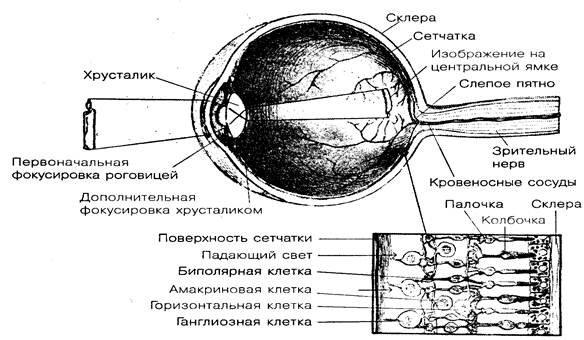 Для того чтобы осмыслить природу цветного зрения, познакомимся поближе с теорией трехцветного зрения, идея которой в 1756 г. была выдвинута Ломоносовым, через 50 лет высказана Т. Юнгом, а еще через 50 лет более подробно разработана Гельмгольцем. Согласно теории Гельмгольца, предполагается наличие у глаза трех следующих физиологических аппаратов: красноощущающего, зеленоощущающего и фиолетовоощущающего. Изолированное возбуждение первого дает ощущение красного цвета. Изолированное ощущение второго аппарата дает ощущение зеленого цвета, а возбуждение третьего — фиолетовый цвет. Однако, как правило, свет одновременно действует на все три аппарата или по крайней мере на два из них. При этом возбуждение этих физиологических аппаратов с различной интенсивностью и в различных пропорциях по отношению друг к другу дает все известные хроматические цвета. Ощущение белого цвета возникает при равномерном возбуждение всех трех аппаратов. Эта теория хорошо объясняет многие явления, в том числе болезнь частичной цветовой слепоты, при которой человек не различает отдельные цвета или цветовые оттенки. Чаще всего отмечается невозможность различить оттенки красного или зеленого цвета. Эта болезнь была названа именем английского химика Дальтона, страдавшего ею. Возможность видеть определяется наличием у глаза сетчатки, представляющей собой разветвление зрительного нерва, входящего сзади в глазное яблоко. В сетчатке имеются аппараты двух типов: колбочки и палочки (названные так из-за своей формы). Палочки и колбочки являются концевыми аппаратами нервных волокон зрительного нерва. В сетчатке человеческого глаза насчитывается около 130 миллионов палочек и 7 миллионов колбочек, которые неравномерно распределены по сетчатке. Колбочки заполняют центральную ямку сетчатки, т. е. то место, куда падает изображение предмета, на который мы смотрим. К краям сетчатки количество колбочек уменьшается. Палочек же больше на краях сетчатки, в середине они практически отсутствуют (рис 7.8). Колбочки обладают малой чувствительностью. Чтобы вызвать их реакцию, нужен достаточно сильный свет. Поэтому с помощью колбочек мы видим при ярком свете. Их еще называют аппаратом дневного зрения. Палочки обладают большей чувствительностью, и с их помощью мы видим ночью, поэтому их называют аппаратом ночного зрения. Однако только с помощью колбочек мы различаем цвета, так как именно они определяют способность вызывать хроматические ощущения. Кроме этого, колбочки обеспечивают необходимую остроту зрения. Бывают люди, у которых не функционирует колбочковый аппарат, и все окружающее они видят только в сером цвете. Такая болезнь называется полной цветовой слепотой. И наоборот, бывают случаи, когда не функционирует палочковый аппарат. Такие люди не видят в темноте. Их болезнь называется гемералопией (или «куриной слепотой»). Завершая рассмотрение природы зрительных ощущений, нам необходимо остановиться еще на нескольких феноменах зрения. Так, зрительное ощущение не прекращается в то же мгновение, как прекращается действие раздражителя. Оно длится еще некоторое время. Это происходит потому, что зрительное возбуждение обладает определенной инерцией. Такое продолжение ощущения в течение некоторого времени называется положительным последовательным образом. Глава 7. О