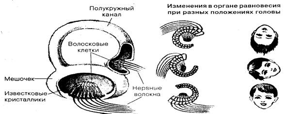 Рис. 7.9. Рецепторы ощущений равновесия Проприоцептивные ощущения. Как вы помните, к проприоцептивным ощущениям относятся ощущения движения и равновесия. Рецепторы ощущений равновесия находятся во внутреннем ухе (рис.7.9). Последнее состоит из трех частей: преддверия, полукружных каналов и улитки. Рецепторы равновесия находятся в преддверии. Перемещение жидкости раздражает нервные окончания, расположенные на внутренних стенках полукружных трубок внутреннего уха, что является источником ощущения равновесия. Следует отметить, что ощущение равновесия в обычных условиях мы получаем не только от названных рецепторов. Например, когда у нас открыты глаза, то положение тела в пространстве определяется и с помощью зрительной информации, а также двигательных и кожных ощущений, через передаваемую ими информацию о движении или информацию о вибрации. Но в некоторых особых условиях, например при нырянии в воду, информацию о положении тела мы можем получать только с помощью ощущения равновесия. Следует отметить, что не всегда сигналы, идущие от рецепторов равновесия, достигают нашего сознания. В большинстве случаев наш организм реагирует на изменение положения тела автоматически, т. е. на уровне бессознательной регуляции. Рецепторы кинестетических (двигательных) ощущений находятся в мышцах, сухожилиях и суставных поверхностях. Эти ощущения дают нам представления о величине и скорости нашего движения, а также о положении, в котором находится та или иная часть нашего тела. Двигательные ощущения играют очень важную роль в координации наших движений. Выполняя то или иное движение, мы, точнее наш мозг, постоянно получаем сигналы от рецепторов, находящихся в мышцах и на поверхности суставов. Если у человека нарушены процессы формирования ощущений движения, то, закрыв глаза, он не может идти, поскольку он не может поддерживать равновесие в движении. Это заболевание называется атаксией, или расстройством движений. Date: 2015-05-08; view: 655; Нарушение авторских прав |