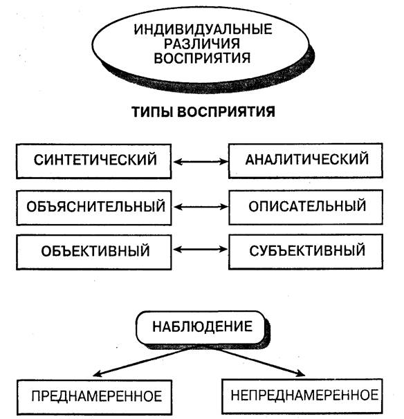 Рис. 8.1. Классификация основных видов восприятия Глава 8. Восприятие • 213 8.4. Индивидуальные различия в восприятии и его развитие у детей Восприятие во многом зависит от особенностей личности. Наши знания, интересы, привычные установки, эмоциональное отношение к тому, что воздействует на нас, влияют на процесс восприятия объективной реальности. Поскольку все люди различаются как по своим интересам и установкам, так и по целому ряду других характеристик, мы можем утверждать, что существуют индивидуальные различия в восприятии (рис. 8.2). Индивидуальные различия в восприятии велики, но тем не менее можно выделить определенные типы этих различий, характерные не для одного конкретного человека, а для целой группы людей. К их числу в первую очередь необходимо отнести различия между целостным и детализирующим, или синтетическим и аналитическим, восприятием.