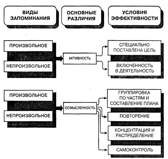 Рис. 10.2. Механизмы запоминания Глава 10. Память • 271 ется возобновление нервных связей, образовавшихся ранее при восприятии предметов и явлений. Как и запоминание, воспроизведение может быть непреднамеренным (непроизвольным) и преднамеренным (произвольным). В первом случае воспроизведение происходит неожиданно для нас самих. Например, проходя мимо школы, в которой учились, мы неожиданно можем воспроизвести образ учителя, который нас учил, или образы школьных друзей. Особым случаем непреднамеренного воспроизведения является появление персеверирующих образов, которые характеризуются исключительной устойчивостью. При произвольном воспроизведении, в отличие от непроизвольного, мы вспоминаем, имея сознательно поставленную цель. Такой целью является стремление вспомнить что-либо из нашего прошлого опыта, например когда мы задаемся целью вспомнить хорошо выученное стихотворение. В этом случае, как правило, слова «идут сами собой». Бывают случаи, когда воспроизведение протекает в форме более или менее длительного припоминания. В этих случаях достижение поставленной цели — вспомнить что-либо — осуществляется через достижение промежуточных целей, позволяющих решить главную задачу. Например, для того чтобы вспомнить какое-либо событие, мы стараемся вспомнить все факты, которые в той или иной мере связаны с ним. Причем использование промежуточных звеньев обычно носит сознательный характер. Мы сознательно намечаем, что может помочь нам вспомнить, или думаем, в каком отношении к нему находится то, что мы ищем, или оцениваем все, что вспоминаем, или судим о том, почему оно не подходит, и т. д. Следовательно, процессы припоминания тесно связаны с процессами мышления. Вместе с тем, припоминая, мы часто сталкиваемся с затруднениями. Мы вспоминаем сначала не то, что нужно, отвергаем это и ставим себе задачу снова что-либо вспомнить. Очевидно, что все это требует от нас определенных волевых усилий. Поэтому припоминание является в то же время и волевым процессом. Помимо воспроизведения мы постоянно сталкиваемся с таким явлением, как узнавание. Узнавание какого-либо объекта происходит в момент его восприятия и означает, что происходит восприятие объекта, представление о котором сформировалось у человека или на основе личных впечатлений (представление памяти), или на основе словесных описаний (представление воображения). Например, мы узнаем дом, в котором живет приятель, но в котором мы никогда не были, а узнавание происходит из-за того, что ранее нам описали этот дом, объяснили, по каким признакам его найти, что отразилось в наших представлениях о нем. Следует отметить, что процессы узнавания отличаются друг от друга степенью определенности. Наименее определенно узнавание в тех случаях, когда мы испытываем только чувство знакомости объекта, а отождествить его с чем-либо из прошлого опыта не можем. Например, мы видим человека, лицо которого нам кажется знакомым, а вспомнить, кто он и при каких обстоятельствах мы могли с ним встречаться, не можем. Подобные случаи характеризуются неопределенностью узнавания. В других случаях узнавание, наоборот, отличается полной определенностью: мы сразу узнаем человека как определенное лицо. Поэтому данные случаи характеризуются полным узнаванием. Date: 2015-05-08; view: 704; Нарушение авторских прав |