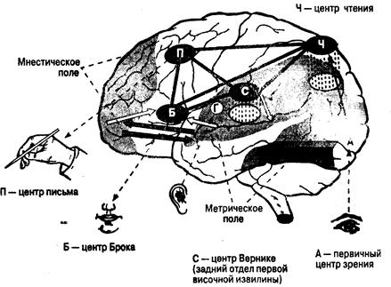 Рис. 13.2. Центральные органы речи (по В. В. Крамеру). Объяснения в тексте Глава 13. Речь • 339 стью можем утверждать, что именно этот нервный центр обеспечивает различение звуков речи. При этом следует отметить, что подобный нервный центр отсутствует у животных, что еще раз доказывает справедливость высказывания о том, что речь — это специфически человеческая функция. Слуховой центр Вернике связан с другим специфическим речевым центром коры — центром Брока, который находится в задней части третьей лобной извилины левого полушария. Это двигательный центр речи. Нарушение нормального функционирования данного центра выражается в том, что человек теряет способность произносить слова. Внешне у него остается способность произносить какие-либо звуки, сохраняется способность двигать языком, поскольку центр, отвечающий за движения голосового аппарата, находится в передней центральной извилине, но он как бы теряет «память приемов произнесения слов», т. е. нарушается интеграция отдельных звуков в слова. Следовательно, центр Брока является также продуктом исторического развития человека и тесно связан с процессом речи. Этот нервный центр также присутствует только у человека, а болезнь, связанная с нарушением его функций, называется моторной афазией. Наиболее ярко взаимосвязь анатомических структур мозга и функций речи проявляется при повреждениях или нарушениях соответствующих участков мозга. Как было сказано выше, речь тесно связана со слуховой (центр Вернике) и моторной (центр Брока) зонами, обеспечивающими ее осуществление. Повреждение любого из этих участков приводит к одной из разновидностей афазии. Для характеристики данных нарушений воспользуемся описаниями больных, которых наблюдал Гарднер в 1975 г. Так, при афазии Брока у больного наблюдается прерывистость речи. Ниже приведено интервью, взятое у больного врачом. Фразы интервьюера обозначены буквой «И», а фразы пациента — буквой «П». И. Вы служили в береговой охране? П. Нет, мм, да, да,... корабль... Массачу...чуссеттс... береговая охрана... лет. (Поднимает руки дважды, показывая на пальцах «19») И. А, вы служили в береговой охране девятнадцать лет. П. А... ох... верно... верно. И. Почему вы в больнице? П. (Показывает на парализованную руку.) Рука нехорошо. (Показывает на рот.) Речь... не могу сказать... говорить, понимаете. И. Что случилось, из-за чего вы потеряли речь? П. Голова, упал, господи, я нехорошо, уд..., уд... о, Боже... удар. И. Не могли бы вы рассказать мне, что вы делали в больнице? П. Да, конечно. Мне идти, ээ, мм, девять часов, речь... два раза... читать... пи... рва, мм, сар, мм, писать... занятия... становится лучше. Как мы видим, речь больного очень неплавная. Даже в простых предложениях много пауз и замешательств. В отличие от этого у пациента с афазией Вернике речь беглая. Ниже приведена речь такого больного: «Уф, я потею, я ужасно нервничаю, знаете, как-то я подхватился. Не могу упоминать про таррипои, месяц назад совсем немного, я здорово сделал, я наложил много, при этом, с другой стороны, знаете, что я имею в виду, мне надо сделать круг, осмотреть, требин и все такое». Помимо беглости есть другие примечательные различия между афазиями Брока и Вернике. Речь пациента с афазией Брока состоит в основном из знаменательных Date: 2015-05-08; view: 620; Нарушение авторских прав |