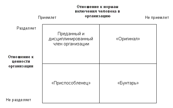 Очевидно, что восприятие и оценка своего опыта, а также процесс адаптации к условиям и требованиям организационного окружения, во многом носят индивидуальный характер. В одной и той же среде люди ведут себя по-разному. У человека как бы имеется две степени свободы в построении своего поведения в организации. С одной стороны, он обладает свободой в выборе форм поведения: принимать или не принимать существующие в организации формы и нормы поведения, с другой — он может принимать или не принимать ценности организации, разделять или не разделять ее цели и философию. В зависимости от того, в какой комбинации сочетаются эти основополагающие составляющие поведения, может быть выделено четыре предельных типа поведения человека в организации. Первый тип: полностью принимаются ценности и нормы поведения. В этом случае человек старается вести себя таким образом, чтобы своими действиями никак не входить в противоречие с интересами организации. Он искренне старается быть дисциплинированным, выполнять свою роль полностью в соответствии с принятыми в организации нормами и формой поведения. Поэтому результаты действий такого человека в основном зависят от его личных возможностей и способностей и от того, насколько верно определено содержание его роли. Такой тип поведения можно охарактеризовать как поведение преданного и дисциплинированного члена организации. Bmopoй тип: человек не приемлет ценностей организации, однако старается вести себя, полностью следуя нормам и формам поведения, принятым в организации. Такого человека можно охарактеризовать как приспособленца. Он делает все правильно и по правилам, но его нельзя считать надежным членом организации, так как он, хотя и является хорошим и исполнительным работником, тем не менее может в любой момент покинуть организацию или совершить действия, которые могут противоречить интересам организации, но соответствовать его собственным интересам. Например, такой человек с готовностью будет участвовать в забастовке для того, чтобы добиться повышения зарплаты. Третий тип: человек приемлет ценности организации, но не приемлет существующие в ней нормы поведения. В данном случае человек может порождать много трудностей во взаимоотношениях с коллегами и руководством, он выглядит оригиналом. Однако если организация может позволить себе отказаться от устоявшихся норм поведения применительно к отдельным ее членам и создать состояние свободы выбора форм поведения для таких ее членов, они могут найти свое место в организации и приносить ей пользу. Четвертый тип: индивид не приемлет ни норм поведения, ни ценностей организации. Это открытый бунтарь, который все время входит в противоречие с организационным окружением и создает конфликтные ситуации. Было бы неверно считать, что такой тип поведения абсолютно неприемлем в организации и люди, ведущие себя таким образом, не нужны организации. Однако в большинстве случаев «бунтари» порождают множество проблем, которые существенно усложняют жизнь организации и даже наносят ей большой ущерб (рис. 1.6). Естественно, организация заинтересована в том, чтобы ее члены вели себя определенным образом. Возможный подход к решению данной проблемы — это подбор людей с определенными качествами, которые могут гарантировать желаемое для организации поведен