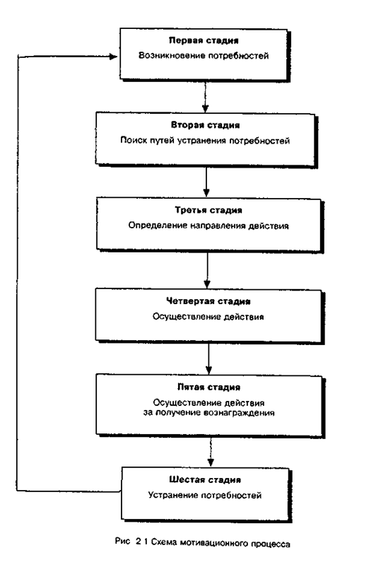 Мотивация, рассматриваемая как процесс, теоретически может быть представлена в виде шести следующих одна за другой стадий. Естественно, такое рассмотрение процесса носит достаточно условный характер, так как в реальной жизни нет столь четкого разграничения стадий и нет обособленных процессов мотивации. Однако для уяснения того, как разворачивается процесс мотивации, какова его логика и составные части, может быть приемлема и полезна ниже приводимая модель. Первая стадия — возникновение потребностей. Потребность проявляется в виде того, что человек начинает ощущать, что ему чего-то не хватает. Проявляется она в конкретное время и начинает «требовать» от человека, чтобы он нашел возможность и предпринял какие-то шаги для ее устранения. Потребности могут быть самыми различными. Условно их можно разбить на три группы: • физиологические; • психологические; • социальные. Вторая стадия — поиск путей устранения потребности. Раз потребность возникла и создает проблемы для человека, то он начинает искать возможности устранить ее: удовлетворить, подавить, не замечать. Возникает необходимость что-то сделать, что-то предпринять. Третья стадия — определение целей (направления) действия. Человек фиксирует, что и какими средствами он должен сделать, чего добиться, что получить для того, чтобы устранить потребность. На данной стадии происходит увязка четырех моментов: • что я должен получить, чтобы устранить потребность; • что я должен сделать, чтобы получить то, что желаю; • в какой мере я могу добиться того, чего желаю; • насколько то, что я могу получить, может устранить потребность. Четвертая стадия — осуществление действия. На этой стадии человек затрачивает усилия для того, чтобы осуществить действия, которые в конечном счете должны предоставить ему возможность получения чего-то, чтобы устранить потребность. Так как процесс работы оказывает обратное влияние на мотивацию, то на этой стадии может происходить корректировка целей. Пятая стадия — получение вознаграждения за осуществление действия. Проделав определенную работу, человек либо непосредственно получает то, что он может использовать для устранения потребности, либо то, что он может обменять на желаемый для него объект. На данной стадии выясняется то, насколько выполнение действий дало желаемый результат. В зависимости от этого происходит либо ослабление, либо сохранение, либо же усиление мотивации к действию. Шестая стадия — устранение потребности. В зависимости от степени снятия напряжения, вызываемого потребностью, а также от того, вызывает устранение потребности ослабление или усиление мотивации к деятельности, человек либо прекращает деятельность до возникновения новой потребности, либо продолжает искать возможности и осуществлять действия по устранению потребности (рис. 2.1). Знание логики процесса мотивации не дает существенных преимуществ в управлении этим процессом. Можно указать на несколько факторов, которые усложняют и делают неясным процесс практического развертывания мотивации. Важным фактором является неочевидность мотивов. Можно предполагать, догадываться по поводу того, какие мотивы действуют, но в явном виде их «вычленить» невозможно. Требуются длительные и скрупулезные наблюдения для того, чтобы попытаться с достаточной степенью досто