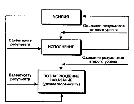 Поведение человека постоянно связано с выбором из двух или нескольких альтернатив. От того, чему человек отдает то или иное предпочтение, зависит что и как он делает, как он себя ведет и каких результатов он добивается. Теория ожидания разработана для того, чтобы дать ответ на вопрос, почему человек делает тот или иной выбор, сталкиваясь с несколькими альтернативами, и насколько он смотивирован добиваться результата в соответствии со сделанным выбором. В самом обобщенном виде теорию ожидания можно сформулировать как учение, описывающее зависимость мотивации от двух моментов: как много человек хотел бы получить и насколько возможно для него получить то, что он хотел бы получить, в частности, как много усилий он готов затрачивать для этого. Например, начинающий бизнесмен из провинции приезжает на переговоры о начале совместного бизнеса с представителями крупных фирм, расположенных в городе, являющемся признанным центром деловой активности. Для поддержания своего реноме он не будет останавливаться в гостинице, имеющей репутацию второсортной, хотя и являющейся дешевой. В то же время у него нет средств, чтобы остановиться в шикарной гостинице. Поэтому, по-видимому, он остановится в такой гостинице, которая является достаточно престижной и на проживание в которой у него хватит средств. Теория ожидания своими корнями уходит в тридцатые годы и связана в значительной мере с разработками Курта Левина [6]. Основными же разработчиками собственно концепций ожидания применительно к мотивации и поведению человека в организации можно назвать В. Врума [12], а также Л. Портера и Э. Лоулера [13]. Процесс мотивации по теории ожидания складывается как бы из взаимодействия трех блоков: 1) усилия; 2) исполнение; 3) результат. Теория ожидания изучает и описывает взаимодействие этих трех блоков. При этом усилия рассматриваются как следствие и даже результат мотивации. Исполнение рассматривается — как следствие взаимодействия усилий, личных возможностей и состояния среды, а результат, как функция, зависящая от исполнения и от степени желания получить результаты определенного типа. Теория ожидания оперирует некоторыми ключевыми для нее категориями, которые имеют в рамках данной теории вполне конкретный смысл. Поэтому, прежде чем излагать собственно теорию, рассмотрим эти категории. Результат в теории ожидания рассматривается на двух уровнях. Результаты первого уровня — это собственно результаты выполнения работы, осуществления действий. Они состоят в качестве и количестве произведенного продукта, величине затраченного времени, объеме потерь времени и т.п. Результаты второго уровня — это те последствия для человека, которые вытекают из результатов первого уровня. Связаны они с возможным вознаграждением или наказанием, которые последуют со стороны руководства и окружения на основе оценки ими результатов первого уровня. Возможными формами проявления результатов второго уровня могут быть увеличение или уменьшение оплаты, продвижение или понижение по службе, позитивная или негативная реакция коллектива и т.п. Валентность отражает то, в какой степени для человека желателен каждый конкретный результат, насколько он для него привлекателен или, наоборот, непривлекателен, т.е. валентность как бы отражает приоритеты для человека тех или иных рез