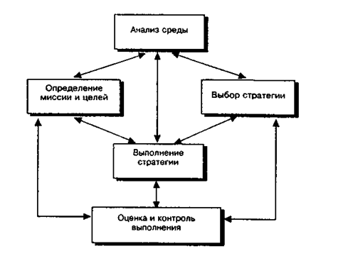 Стратегическое управление можно рассматривать как динамическую совокупность пяти взаимосвязанных управленческих процессов. Эти процессы логически вытекают (или следуют) один из другого. Однако существует устойчивая обратная связь и, соответственно, обратное влияние каждого процесса на остальные и на всю их совокупность. Это является важной особенностью системы стратегического управления. Схематически структура стратегического управления изображена на рис. 3.1. Анализ среды обычно считается исходным процессом стратегического управления, так как он обеспечивает базу для определения миссии и целей фирмы и для выработки стратегий поведения, позволяющих фирме выполнить миссию и достичь своих целей. Анализ среды предполагает изучение трех ее частей: 1) макроокружения; 2) непосредственного окружения; 3) внутренней среды.