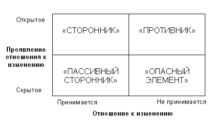 Выполнение стратегии предполагает проведение необходимых изменений, без которых даже самая хорошо проработанная стратегия может потерпеть провал. Поэтому с полной уверенностью можно утверждать, что стратегические изменения — это ключ к выполнению стратегии. Проведение стратегических изменений в организации является очень сложной задачей. Трудности решения этой задачи в первую очередь связаны с тем, что всякое изменение встречает сопротивление, которое иногда может быть столь сильным, что его не удается преодолеть тем, кто проводит изменения. Поэтому, для того чтобы провести изменения, необходимо, как минимум, проделать еле дующее: • вскрыть, проанализировать и предсказать то, какое сопротивление может встретить планируемое изменение; • уменьшить до возможного минимума это сопротивление (потенциальное и реальное); • установить статус-кво нового состояния. Носителями сопротивления так же, как и носителями изменений, являются люди. В принципе люди не боятся изменений, они боятся быть измененными. Люди боятся того, что изменения в организации затронут их работу, их положение в организации, т.е. сложившийся статус-кво. Поэтому они стремятся помешать изменениям с тем, чтобы не попасть в новую, не совсем ясную для них ситуацию, в которой им придется мноюе делать не так, как они уже привыкли делать, и заниматься не тем, чем они занимались ранее. Отношение к изменению может быть рассмотрено как комбинация состояний двух факторов: 1) принятие или непринятие изменения; 2) открытая или скрытая демонстрация отношения к изменению (рис. 5.3).