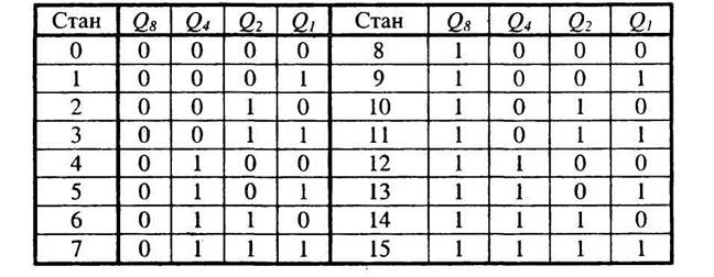 Рис. 7.5- Часові діаграми роботи чотирирозрядного двійково-десяткового лічильника Таблиця 8.2 Таблиця переходів чотирирозрядного послідовного двійково-десяткового лічильника