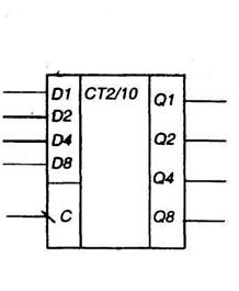 У вигляді ІМС випускається досить ши-рока номенклатура лічильників. На рис. 7.7 як приклад наведене умовне позначення чотирирозрядного реверсивного лічильника типу К561ИЕ14. Він має входи: 1) запису інформації з входів паралельного вводу інформації D1, D2, D4, D8 - WR; 2) паралельного вводу інформації - D1, D2, D4, D8;