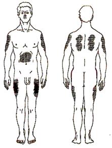 Подкожно-жировой слой хорошо снабжен кровеносными сосудами, поэтому для более быстрого действия лекарственного вещества применяют подкожные инъекции (п/к). Подкожно введенные лекарственные вещества быстрее всасываются, чем при введении через рот. П/к инъекции производят иглой на глубину 15 мм и вводят до 2 мл лекарственных препаратов, которые быстро всасываются в рыхлой подкожной клетчатке и не оказывают на нее вредного воздействия. Характеристика игл, шприцев для п/к инъекций: Длина иглы -20 мм Сечение -0,4 мм Объём шприца - 1; 2 мл -средняя треть передненаружной поверхность плеча; -средняя треть передненаружной поверхность бедра; -подлопаточная область; -передняя брюшная стенка. В этих местах кожа легко захватывается в складку и отсутствует опасность повреждения кровеносных сосудов, нервов и надкостницы. Не рекомендуется производить инъекции: в места с отечной подкожно-жировой клетчаткой; в уплотнения от плохо рассосавшихся предыдущих инъекций. Оснащение: Стерильно: лоток с марлевыми туфиками или ватными шариками, шприц объёмом 1,0 или 2,0 мл, 2 иглы, спирт 70%, ЛС, перчатки. Нестерильно: ножницы, кушетка или стул, ёмкости для дезинфекции игл, шприцев, перевязочного материала. Алгоритм выполнения: 1. Объясните пациенту ход проведения манипуляции, получите от него согласие. 2. Наденьте чистый халат, маску обработайте руки на гигиеническом уровне, наденьте перчатки. 3. Наберите лекарственное средство, выпустите из шприца воздух, положите в лоток. 4. Усадите или уложите пациента, в зависимости от выбора места инъекции и ЛС. 5. Осмотрите и пропальпируйте область инъекции. 6. Обработайте место инъекции последовательно в одном направлении 2 ватными шариками, смоченными 70% раствором спирта: вначале большую зону, затем вторым шариком непосредственно место инъекции, заложите его под мизинец левой руки. 7. Возьмите в правую руку шприц (указательным пальцем правой руки держите канюлю иглы, мизинцем - поршень шприца, 1,3,4 пальцами держите цилиндр). 8. Соберите левой рукой кожу в складку треугольной формы, основанием вниз. 9. Введите иглу под углом 45° срезом вверх в основание кожной складки на глубину 1-2 см (2/3 длины иглы), придерживайте указательным пальцем канюлю иглы. 10. Перенесите левую руку на поршень и введите лекарственное средство (не перекладывайте шприц из одной руки в другую). 11. Прижмите место укола ватным шариком с 70 % спиртом. 12. Извлеките иглу, придерживая ее за канюлю. 13. Сбросьте одноразовый шприц и иглу в ёмкости c 3% хлорамином на 60 мин. 14. Снять перчатки, поместить в ёмкость с дезинфицирующим раствором. 15. Вымыть руки, осушить. Примечание. Во время инъекции и после неё через 15-30 мин узнать у пациента о его самочувствии и о реакции на введённое ЛС (выявление осложнений и реакций). Рис.1. Места для п/к инъекций