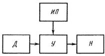 Усилителем называется устройство, предназначенное для преобразования электрических сигналов. Мощность электрических сигналов, поступающих с выхода усилителя в цепь нагрузки, значительно превышает мощность входного сигнала. Функциональная схема усилительного каскада приведена на рис. 3.1. При поступлении на вход усилительного элемента У электрического сигнала от датчика Д изменяется ток, протекающий в цепи усилительного элемента от источника питания ИП, и изменяется мощность, отдаваемая источником в цепь нагрузки Н. Таким образом, увеличение мощности, получаемой нагрузкой, по сравнению с мощностью, отдаваемой датчиком, достигается за счёт передачи в нагрузку мощности от источника питания.