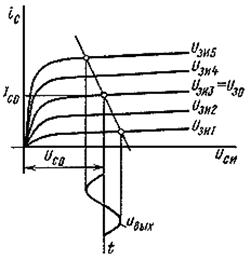 Недостатками усилительных каскадов с применением биполярных транзисторов являются: 1) относительно малое входное сопротивление, что не позволяет применять их в схемах с высокоомными источниками сигнала; 2) сильная зависимость характеристик от температуры. В значительной мере недостатков биполярных транзисторов лишён полевой транзистор. В усилительных каскадах полевой транзистор может быть включен по схеме с общим истоком (ОИ), общим стоком (ОС) или общим затвором (ОЗ). Чаще всего используется схема с общим истоком, поскольку она даёт усиление по току, напряжению и наибольшее усиление по мощности. Схема каскада ОИ приведена на лицевой панели лабораторной установки. Входной сигнал подаётся между затвором и общей шиной. Выходным напряжением является переменное напряжение между стоком и общей шиной. Назначение конденсаторов В схеме резисторы Выходные характеристики для каскада с общим истоком можно найти графически, подобно тому, как это делается для каскада на биполярных транзисторах. На рис. 4.2 приведены выходные характеристики полевого транзистора, дающие зависимость тока стока от напряжения сток – исток: При наличии переменного сигнала на входе каскада ток стока изменяется. Это приводит к изменению напряжения сток – исток за счёт изменения падения напряжения на резисторе