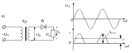 2. Однотактные выпрямители Однофазный однотактный однополупериодный выпрямитель. Простейший однофазный однотактный выпрямитель (рис. 2.1. а) состоит из силового трансформатора Тр и вентиля В. Рассмотрим в этом параграфе работу выпрямительных схем без сглаживающих фильтров. Процесс выпрямления переменного тока показан графически на рисунке 2.1. б в предположении, что вентиль является идеальным.