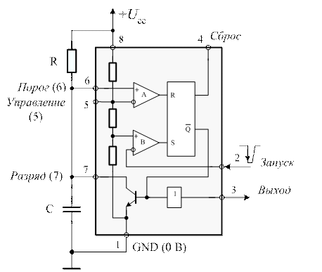 Рис. 10. Моностабильная конфигурация таймера NE555 (К1006ВИ1).