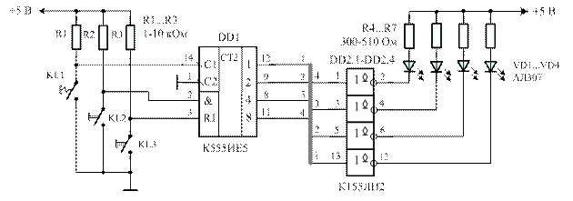Указания к выполнению работы: 1. Статические входы микросхем счётчиков не подключённые к ключам управления соединить с питанием + E п схемы, (установить в лог.”1”) или “заземлить” (установить в лог.”0”). 2. В схемах с КМОП-счётчиками использовать напряжение питания E п=+5 В. 3. Для снижения влияния эффекта дребезга к контактам кнопки КL1 (рис.15) параллельно подключить конденсатор емкостью несколько микрофарад или использовать специальную схему запуска на ждущем мультивибраторе.