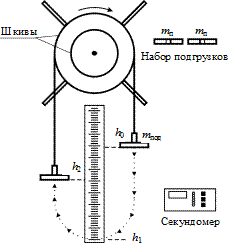Установка представляет собой тело со шкивом радиусом r, которое вращается в шарикоподшипниках. На шкив намотана нить, один конец которой прикреплен к шкиву, а другой – к подставке массой