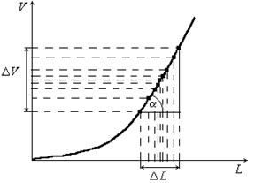 Часто для практических целей достаточно произвести однократное измерение интересующей величины. В этом случае невозможно оценить погрешность, связанную со всеми случайными факторами «внешней среды», но мы должны быть уверены, что она достаточно мала. Чтобы убедиться в этом, необходимо хотя бы раз произвести многократное измерение величины и определить случайную погрешность. Но в любом случае остаются погрешности, связанные с использованием для измерения конкретных приборов. Поэтому результат однократного измерения представ-ляется в виде: x ± δ x, где x – значение величины, полученное в процессе однократного прямого или косвенного измерения; δ x – погрешность однократного измерения. Количество измерений(одно) и доверительная вероят-ность P ( 100 %) в этом случае не указываются, в отличие от результата многократного измерения. Величина δx в случае однократного прямого измерения представляет собой приборную погрешность (см. п. 1.3). Возникает закономерный вопрос об определении погреш-ностикосвенного измерения в этой ситуации. Перед тем как дать общий рецепт, рассмотрим достаточно простой частный случай такого определения. Пусть стоит задача измерения объёма куба. Самый простой способ решения задачи связан с измерением L – длины ребра куба. После того как она определена, величина объёма куба рассчитывается по формуле V = L 3. Если измерение L производилось однократно с помощью линейки, то результат такого прямого измерения представля-ется так: L ± δ L, где L – значение длины ребра, полученное в процессе однократного измерения; δ L – погрешность прямого измерения, равная погрешности линейки. Логично потребовать, чтобы результат косвенного измерения объёма имел вид: V ± δ V. Значение объёма V рассчитывается по формуле, связывающей его со значением длины ребра L. Остаётся определить величину δ V – погрешность для косвенного измерения объёма. Очевидно, эта величина каким-то образом должна быть связана с величиной δ L. Чтобы обнаружить эту связь, нам придётся снова обратиться к процедуре многократного измерения, но результат, который мы при этом получим, будет справедлив и для однократных измерений. Пусть в процессе многократных измерений мы получили для одного и того же куба множество значений величины L, измеренной прямым способом, и соответствующее множество величины V, рассчитанной по формуле. Каждому значению L i первого множества соответствует вполне определенное значение Vi второго множества. На рис. 3 представлен график зависимости V = L 3, на котором изображены точки, соответствующие результатам многократных измерений, произведённых для одного и того же куба (разброс значений очень сильно преувеличен). На оси L выделен интервал Δ L, характеризующий разброс значений длины ребра, полученный в процессе многократных прямых измерений. На оси V выделен соответствующий интервал Δ V, характеризующий разброс значений объёма, полученный в процессе вычислений. Эти интервалы определяют погрешности измерений величин L и V. Будем считать, что Δ L и Δ V достаточно малые величины по сравнению со значениями L и V. Тогда их очень просто можно связать между собой. Из треугольника (см. рис.3) следует Δ V =