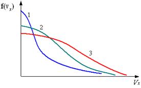 20. В трех одинаковых сосудах условиях находится одинаковое количество газа, причем Т1> Т2 >Т3. Распределение проекций скоростей молекул водорода на произвольное направление Х для молекул в сосуде с температурой T1 будет описывать кривая...