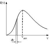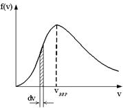 26. На рисунке представлен график функции распределения молекул идеального газа по скоростям (распределение Максвелла), где f(v)=dN/N dv – доля молекул, скорости которых заключены в интервале скоростей от v до v+dv в расчете на единицу этого интервала.