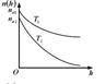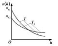33. В очень высоком вертикальном цилиндрическом сосуде находится идеальный газ при некоторой температуре Т1.Если считать внешнее потенциальное поле сил однородным, то график зависимости концентрации n(h) от высоты h для двух температур Т1 иТ2> Т1 имеет вид, представленный на рисунке…
