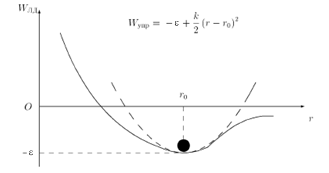 Рис. 1.10. Потенциал Леннард–Джонса. Видна потенциальная яма. Дно ямы соответствует расстоянию между молекулами, равному r 0, и энергии ε. Пунктиром изображена потенциальная энергия взаимодействия сил упругости (см. п. 2.3). Выражение для этой потенциальной энергии приведено в формуле (1.26). Расстояние r 0 соответствует положению равновесия