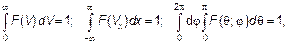 где F (V) dV — вероятность, что скорость имеет величину, лежащую от V до V + dV, F (θ, φ) d θ d φ — вероятность, что скорость направлена под углами от θ до θ + d θ и от φ до φ + d φ. Формула (3.10) и выражает положение о перемножении вероятностей, но в применении к вероятностям, связанным со скоростью молекулы. Применим теперь положение о нормировке, так называется сформулированное ранее правило о том, что сумма вероятностей всех исходов равна единице. Это правило называется условие нормировки. При малых интервалах величин скоростей, для которых вычисляется вероятность (а дифференциалы соответствуют «бесконечно малым» интервалам), сумма заменяется интегралом и, например,