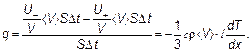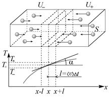 Коэффициент пропорциональности χ (читается «хи») называется коэффициентом теплопроводности. Размерность коэффициента теплопроводности будет: [χ] = Дж/(мс ⋅ К) = кг ⋅ м/(с3 ⋅ К). Можно выразить коэффициент теплопроводности через характеристики газа (характеристики молекулярного движения). Для этого необходимо ввести внутренние энергии единицы объема справа и слева U+/ V и U –/ V и умножить их на объем, из которого молекулы за время Δ t успеют долететь до выделенного сечения, имеющего температуру t 0. Для упрощения вычислений удобно внутреннюю энергию выражать не через молярную теплоемкость и количество вещества U = сV ν T, а через удельную теплоемкость и массу U ± = cm [ T ± l (dT / dx)]. При вычислении объема, из которого молекулы «долетают», важно отметить, что хотя температуры по разные стороны сечения теперь не одинаковы, при небольших их изменениях можно использовать и для объема «справа», и для объема «слева» одну и ту же скорость á V ñ. Тогда