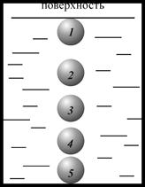 В повседневной жизни, в быту и на работе наряду с силами тяготения, трения, упругости, действует еще и сила поверхностного натяжения. Без действия этой силы нельзя было бы ничего сделать с любой жидкостью: нельзя было бы налить воды в чашку, даже слабый дождик промочил бы вас насквозь, полотенцем нельзя было бы вытереться, паста из шариковой ручки вытекла бы и все испачкала. Задумайтесь, отчего образуются мыльные пузыри, ведь именно пузыри образуются при намыливании рук. Рассмотрите образование капли. Она постепенно растет, возникает сужение — шейка, и капля отрывается. Вода как бы заключена в эластичную пленку. Пленка разрывается под весом воды. Именно поверхностное натяжение проявляет себя как такая пленка. Оказывается, поверхностное натяжениеесть результат взаимодействия молекул жидкости. Молекулы притягиваются друг к другу, и в результате каждая молекула стремится оказаться внутри, а общая поверхность максимально сокращается. Хорошей моделью такого явления является пчелиный рой. В этой модели заметно и отличие силы поверхностного натяжения от силы упругости. При сокращении пленки сила упругости уменьшается. Сила поверхностного натяжения при сокращении пленки остается неизменной, лишь бы осталась неизменной длина границы, на которую сила поверхностного натяжения действует. Рассмотрим поверхностное натяжение молекул жидкости (рис. 5.1). Вспомним, что на малых расстояниях молекулы отталкиваются, а на больших — притягиваются. На молекулу 1, находящуюся у самой поверхности, действует сила отталкивания со стороны молекул 2 и сила притяжения со стороны всех остальных (3, 4, 5,...) молекул. На молекулу 2, которая находится чуть глубже, действуют те же силы: отталкивания со стороны молекулы 3, притяжения со стороны молекул 4, 5,..., но, кроме того, еще и сила отталкивания со стороны молекулы 1. Именно эта сила сближает молекулы 2 и 3. В результате, расстояние 1 – 2 больше расстояния 2 – 3, расстояние 2 – 3, в свою очередь, больше расстояния 3 – 4, и так до тех пор, пока не перестанет сказываться близость молекул к поверхности.