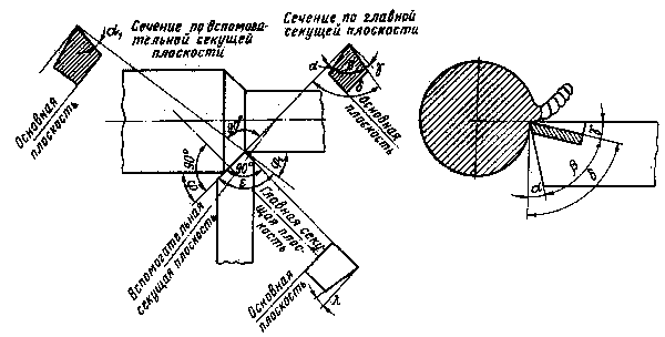 Обрабатываемой называют необработанную поверхность, с которой будет срезаться стружка. Обработанной считается поверхность, образованная после срезания стружки. Поверхность резания является переходной между обрабатываемой и обработанной поверхностями. В процессе резания она находится, в контакте с главным лезвием инструмента. Взаимное расположение резца и детали характеризуется исходными плоскостями. К ним относятся: а) основная – плоскость, параллельная продольной и поперечной подачам; б) плоскость резания – плоскость, касательная к поверхности резания и проходящая через главное лезвие. В этой плоскости лежит вектор скорости резания; в) главная секущая (нормальная) – плоскость, перпендикулярная проекции главного лезвия на основную плоскость; г) продольная секущая – плоскость, перпендикулярная основной плоскости и направлению продольной подачи (вдоль резца); д) поперечная секущая – плоскость, перпендикулярная основной плоскости и направлению поперечной подачи (поперек резца). Режущий клин резца как геометрическое тело можно охарактеризовать углами, отмеченными на рисунке 3.