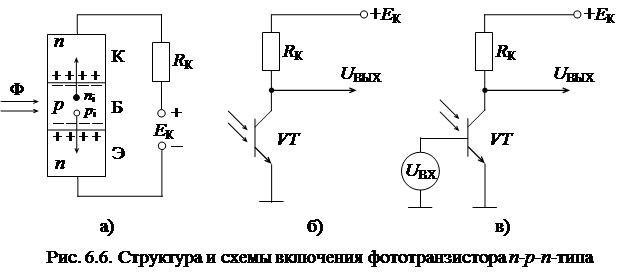 Фототранзистором (ФТ) называют фотогальванический элемент с двумя p-n- переходами, предназначенный для преобразования светового потока в электрические сигналы. Структура и схемы включения фототранзистора показаны на рис. 6.6.