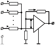 Сумматор предназначен для формирования напряжения, равного усилен- ной алгебраической сумме нескольких входных сигналов, т.е. выполняет мате- матическую операцию суммирования нескольких сигналов. При этом выходной сигнал дополнительно инвертируется, отсюда и название – инвертирующий сумматор. Схема инвертирующего сумматора приведена на рисунке 9.1. Число параллельных ветвей на входе равно количеству сигналов, предназначенных для сложения. Сопротивления резисторов принимают одинаковыми: